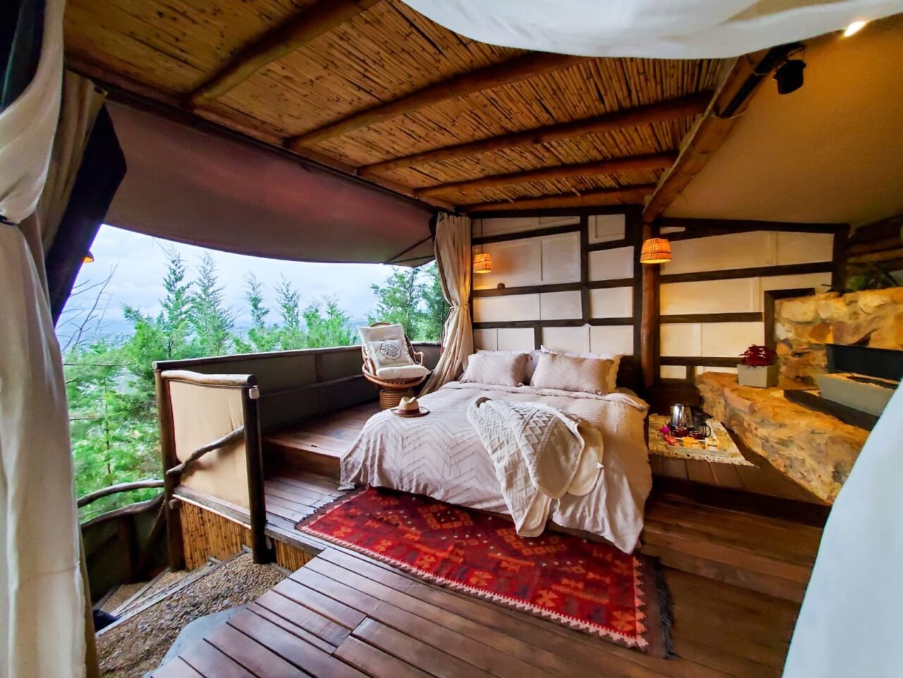 Tiendas de campaña safari: Inspiradas en las tiendas de la época colonial, estas tiendas están equipadas con camas cómodas, muebles elegantes y baños privados.